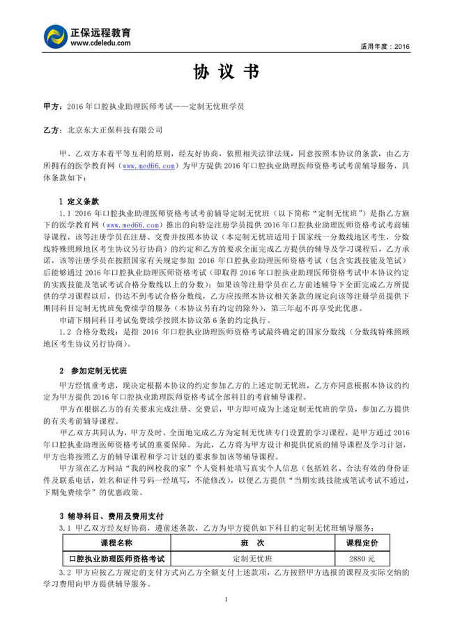 口腔執(zhí)業(yè)助理醫(yī)師“定制無(wú)憂班”協(xié)議書