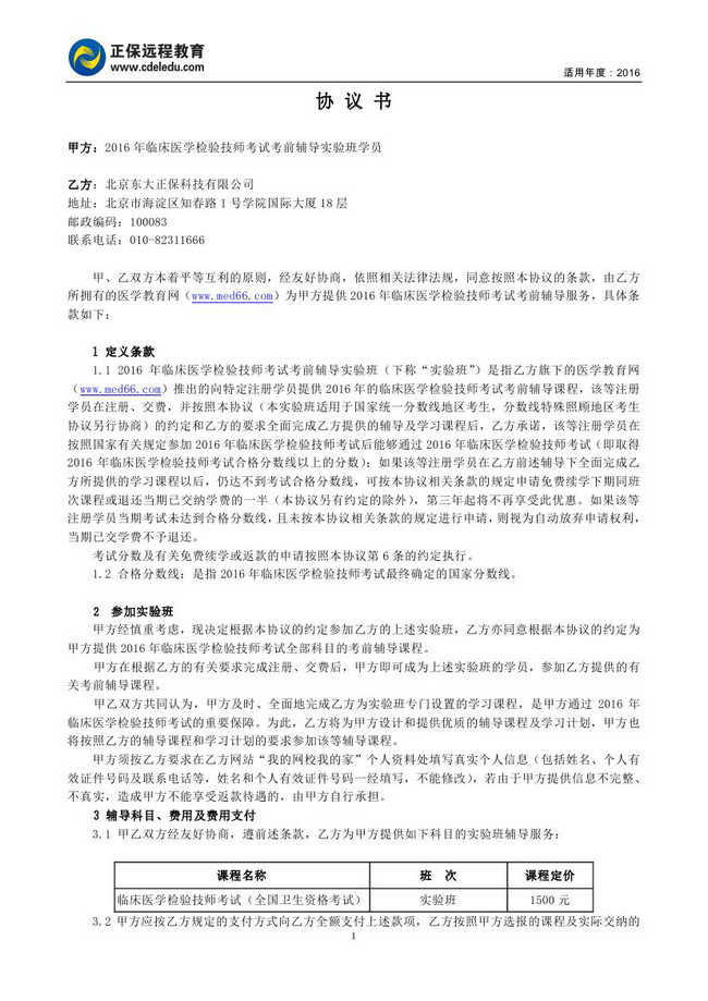 臨床醫(yī)學檢驗技師考試“實驗班”協(xié)議書