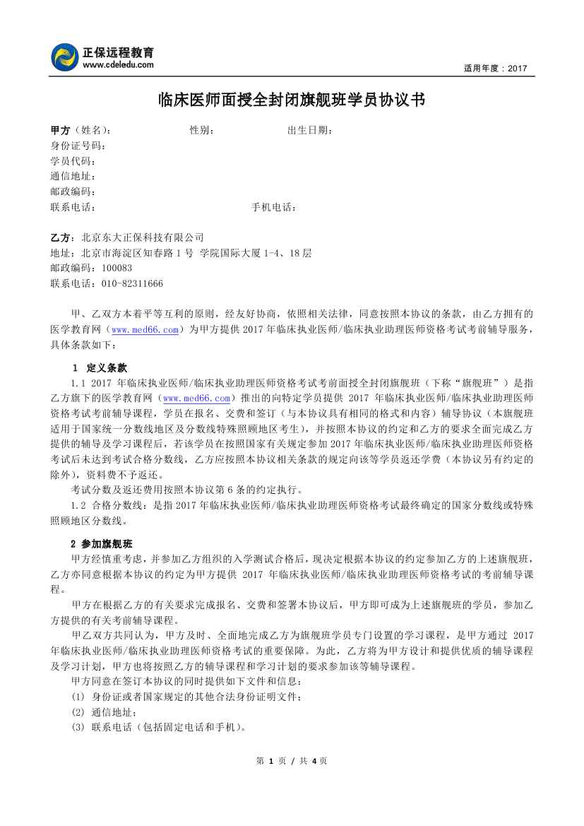 臨床醫(yī)師“面授全封閉旗艦班”協(xié)議書