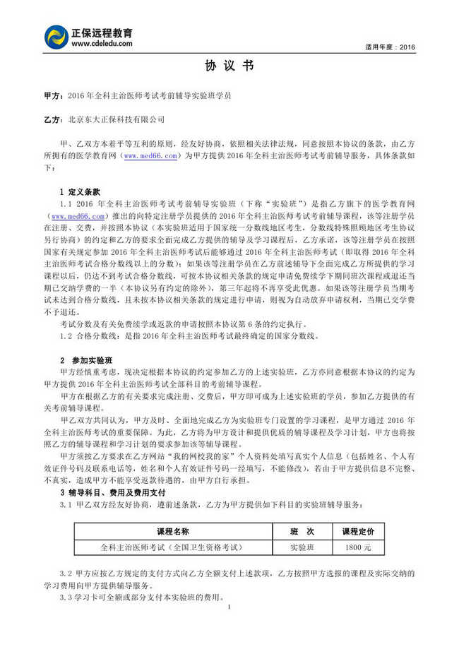 全科主治醫(yī)師考試“實(shí)驗(yàn)班”協(xié)議書(shū)