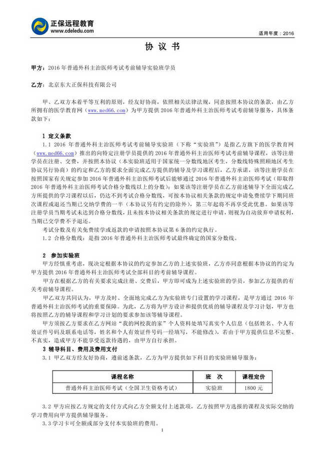外科主治醫(yī)師考試“實(shí)驗(yàn)班”協(xié)議書(shū)