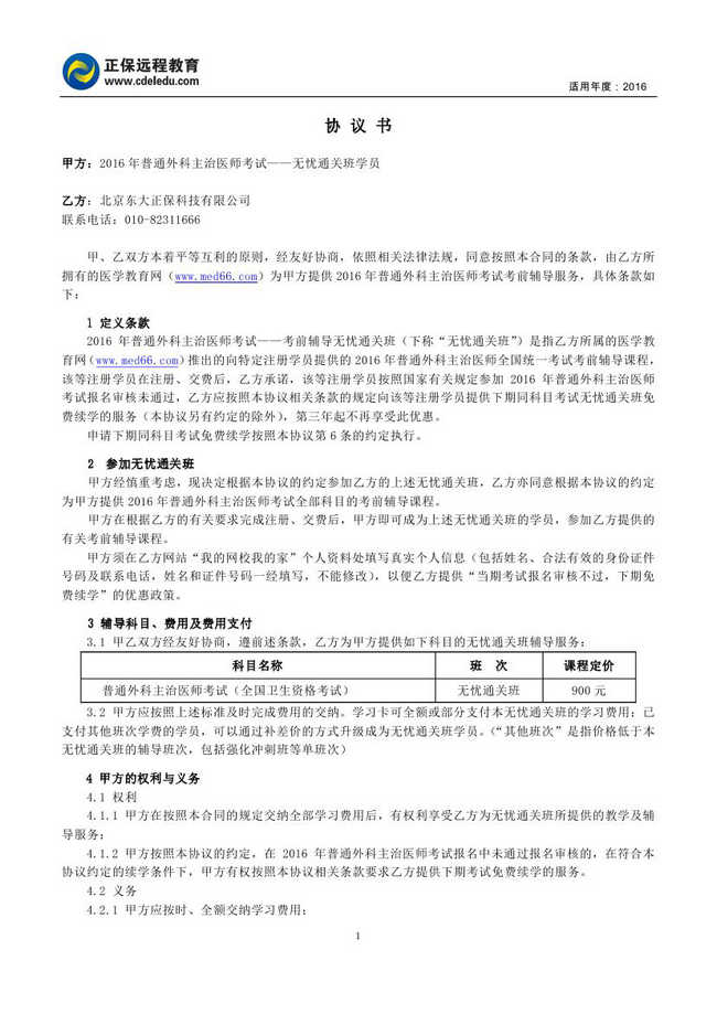 外科主治醫(yī)師考試“無(wú)憂(yōu)通關(guān)班”協(xié)議書(shū)
