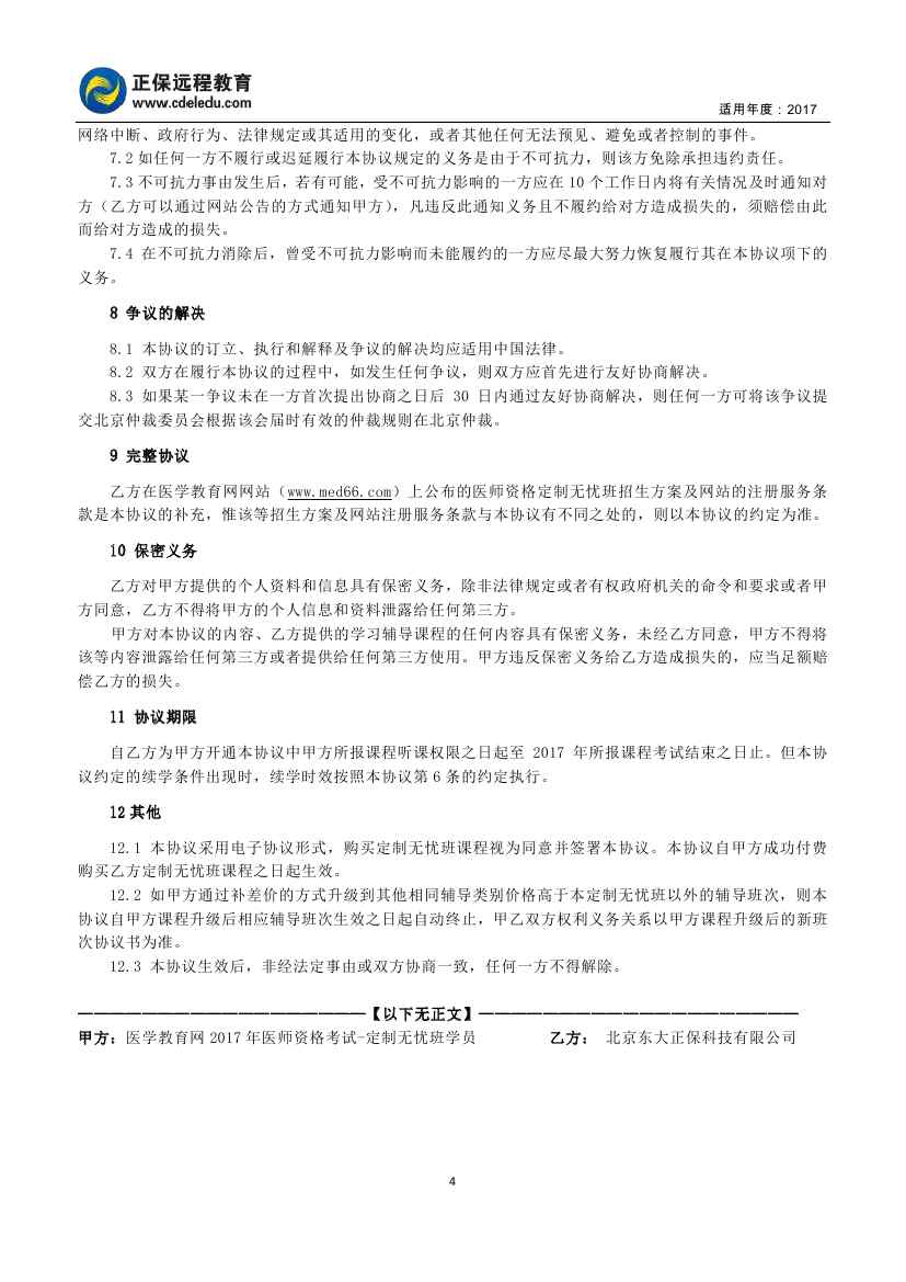 2017年醫(yī)師資格“定制無(wú)憂班”協(xié)議書(shū)