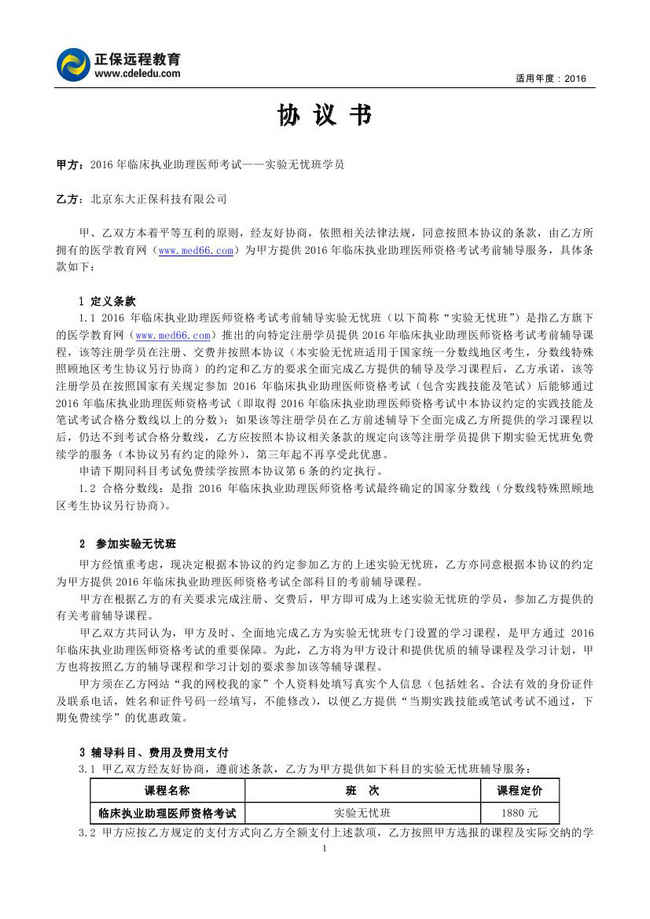 臨床執(zhí)業(yè)助理醫(yī)師“實(shí)驗(yàn)無憂班”協(xié)議書