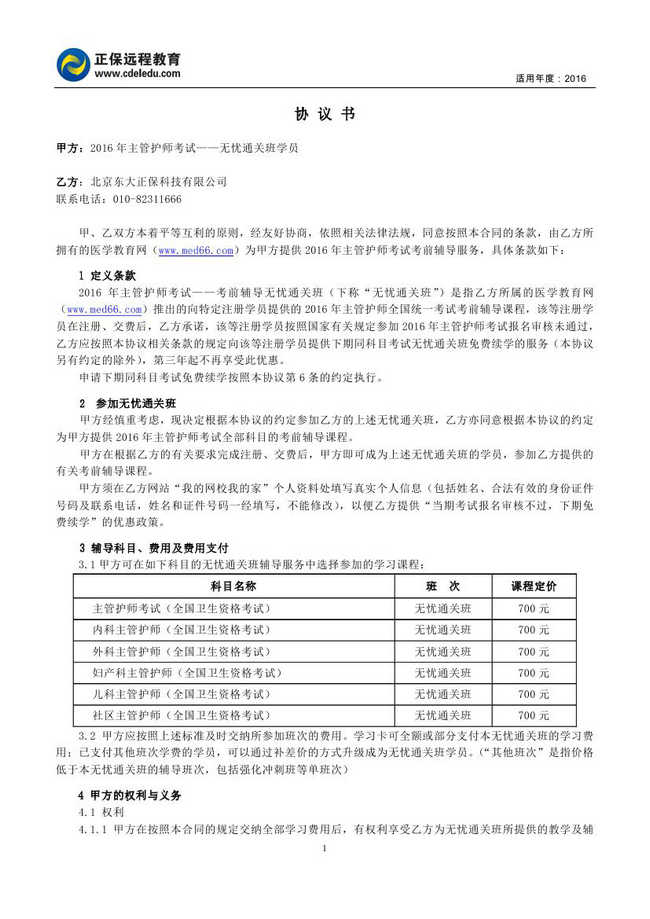 主管護(hù)師“無憂通關(guān)班”協(xié)議書