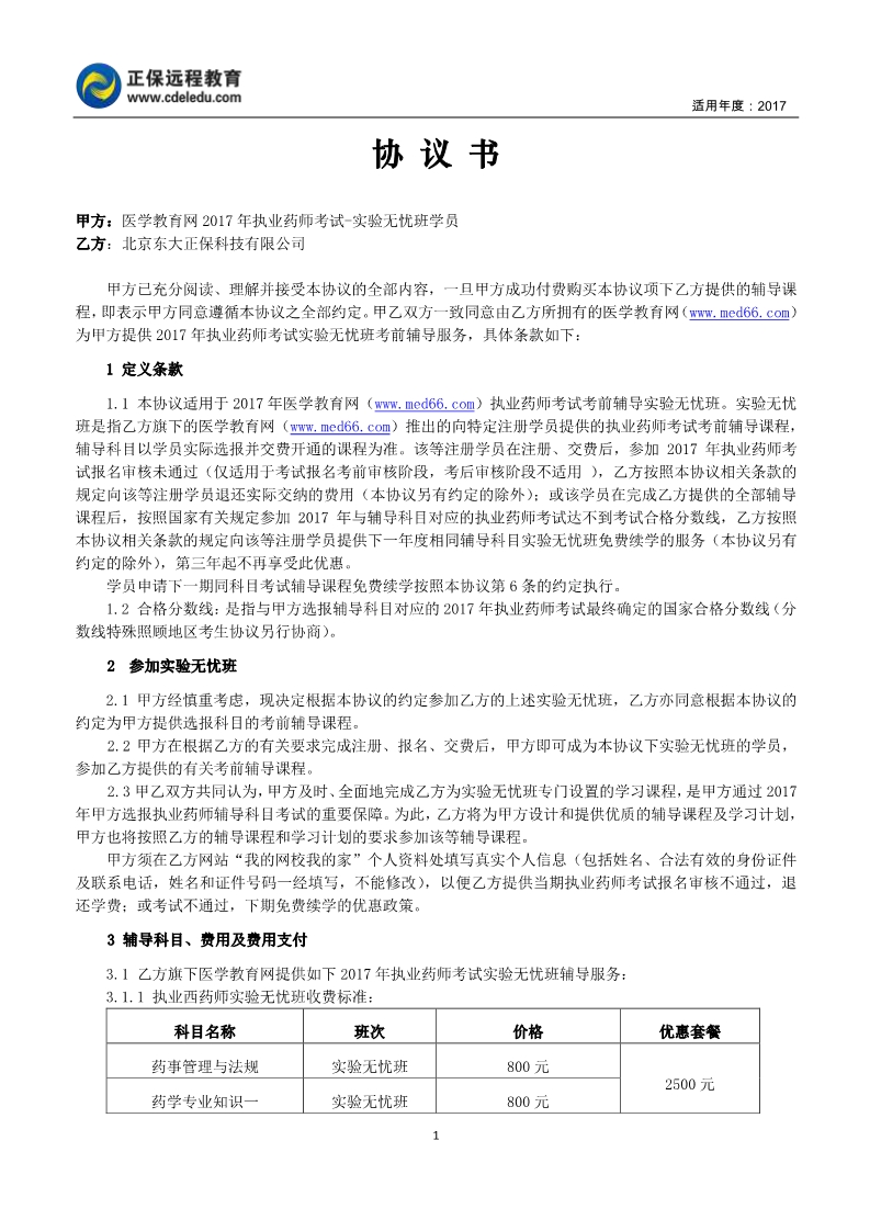 執(zhí)業(yè)藥師“實驗無憂班”協(xié)議書