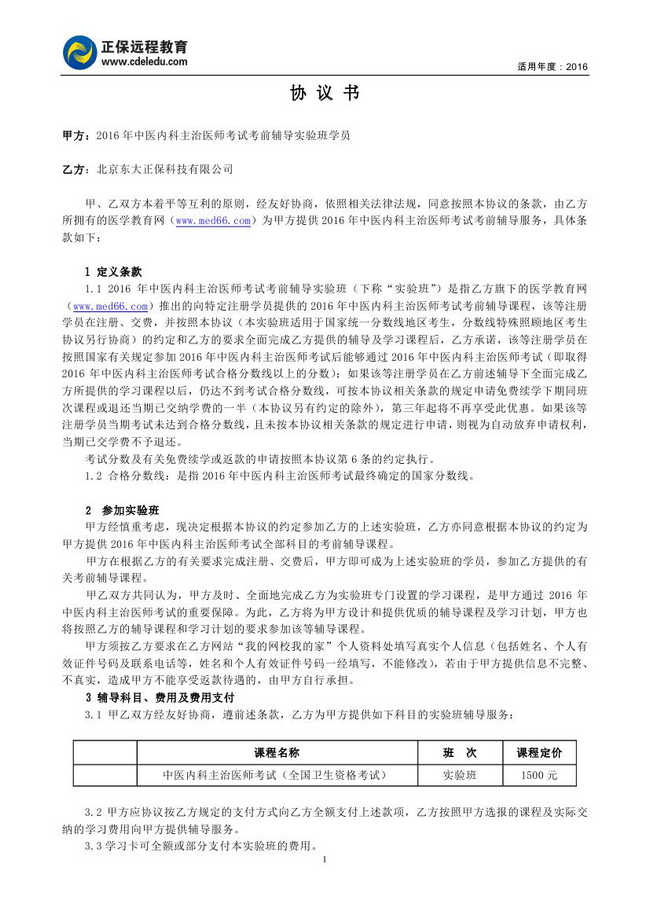 中醫(yī)內(nèi)科主治醫(yī)師考試“實驗班”協(xié)議書