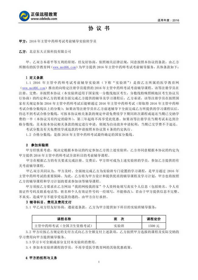 主管中藥師考試“實(shí)驗(yàn)班”協(xié)議書