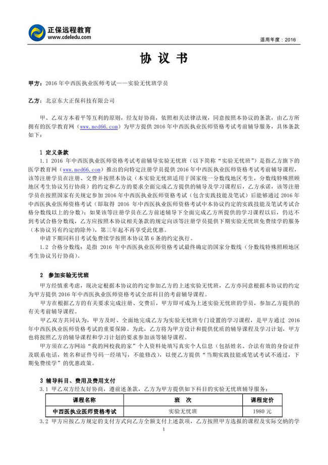 中西醫(yī)結合執(zhí)業(yè)醫(yī)師“實驗無憂班”協(xié)議書