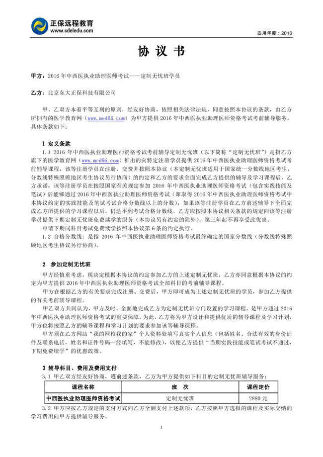 中西醫(yī)結(jié)合執(zhí)業(yè)助理醫(yī)師“定制無(wú)憂(yōu)班”協(xié)議書(shū)