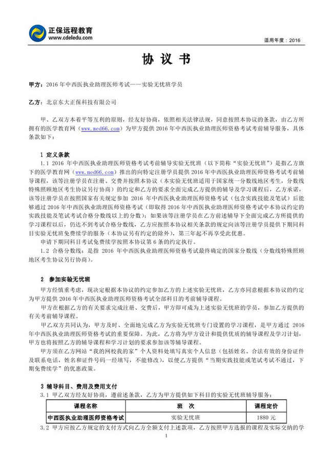 中西醫(yī)結(jié)合執(zhí)業(yè)助理醫(yī)師“實(shí)驗(yàn)無憂班”協(xié)議書