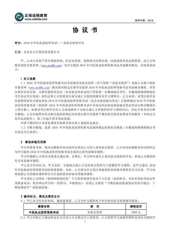 中醫(yī)執(zhí)業(yè)醫(yī)師“實(shí)驗(yàn)無憂班”協(xié)議書