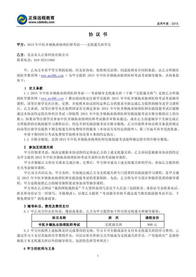 中醫(yī)鄉(xiāng)鎮(zhèn)助理醫(yī)師“無憂通關(guān)班”協(xié)議書