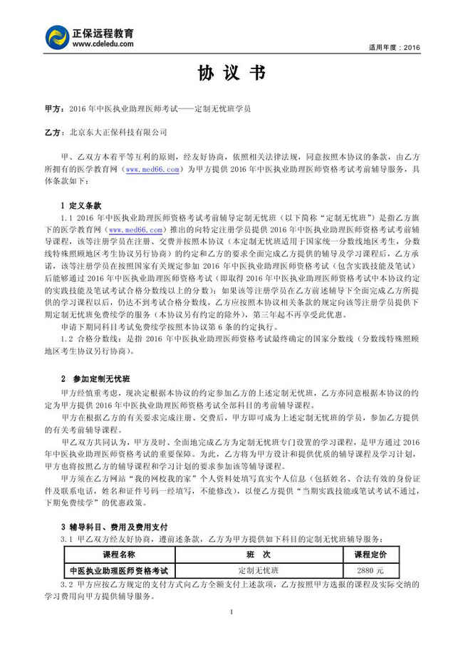 中醫(yī)執(zhí)業(yè)助理醫(yī)師“定制無(wú)憂(yōu)班”協(xié)議書(shū)