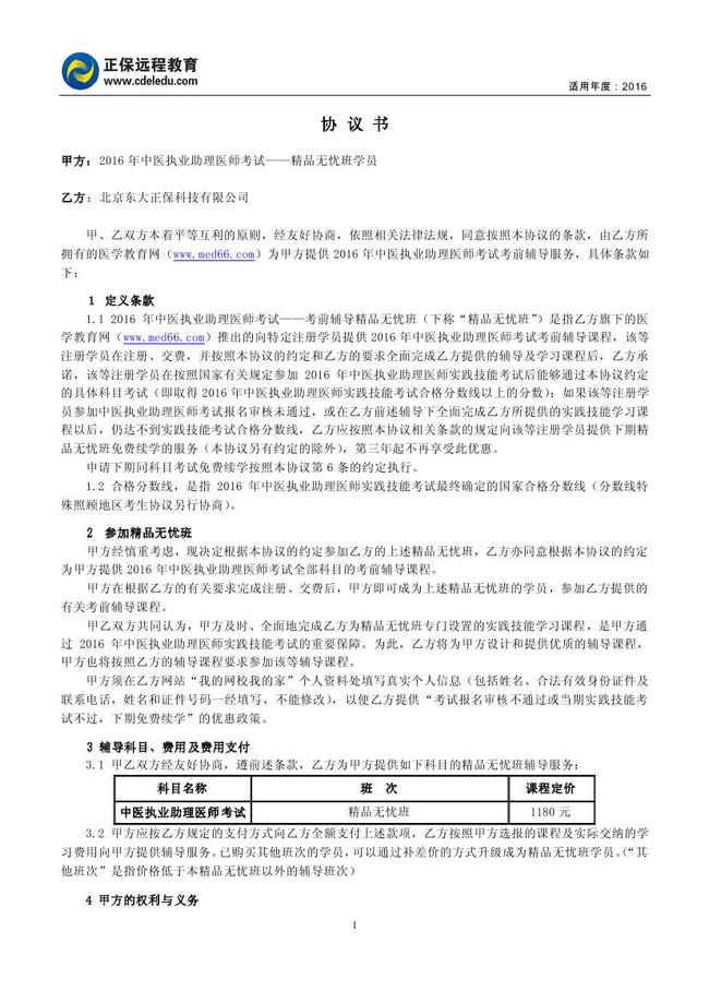 中醫(yī)執(zhí)業(yè)助理醫(yī)師“精品無(wú)憂班”協(xié)議書(shū)
