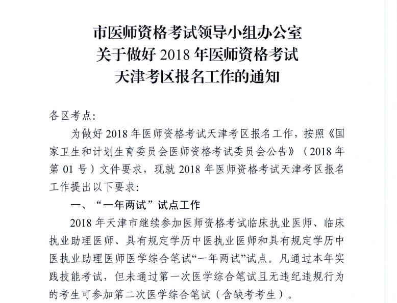 根據(jù)天津市2018年醫(yī)師資格考試報名工作通知內(nèi)容,2018年天津市繼續(xù)參加醫(yī)師資格考試臨床以及規(guī)定學(xué)歷中醫(yī)醫(yī)師“一年兩試”試點工作,請涉及到的相關(guān)考生仔細(xì)查看具體工作安排和要求。