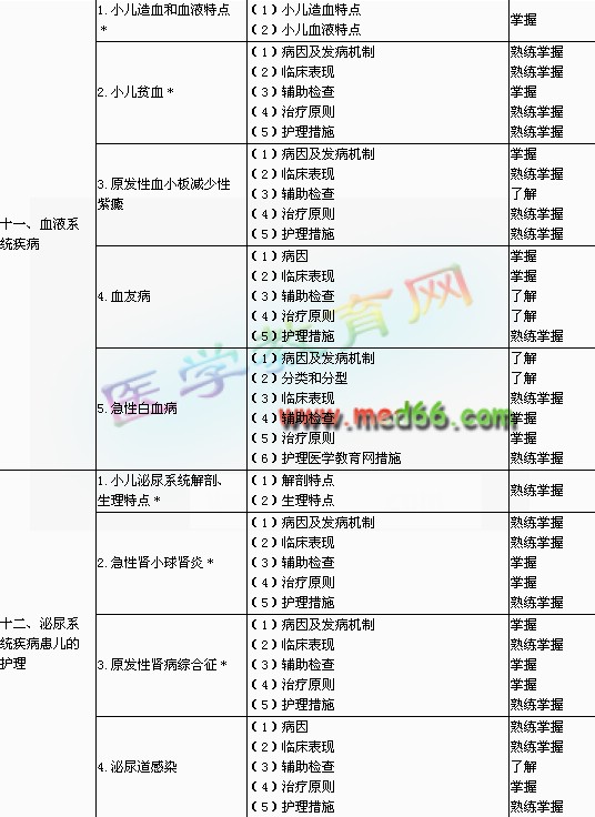 | 3.兒童糖尿病 | (1)病因及發(fā)病機制 (2)臨床表現(xiàn) (3)輔助檢查 (4)治療原則 (5)護理措施 |