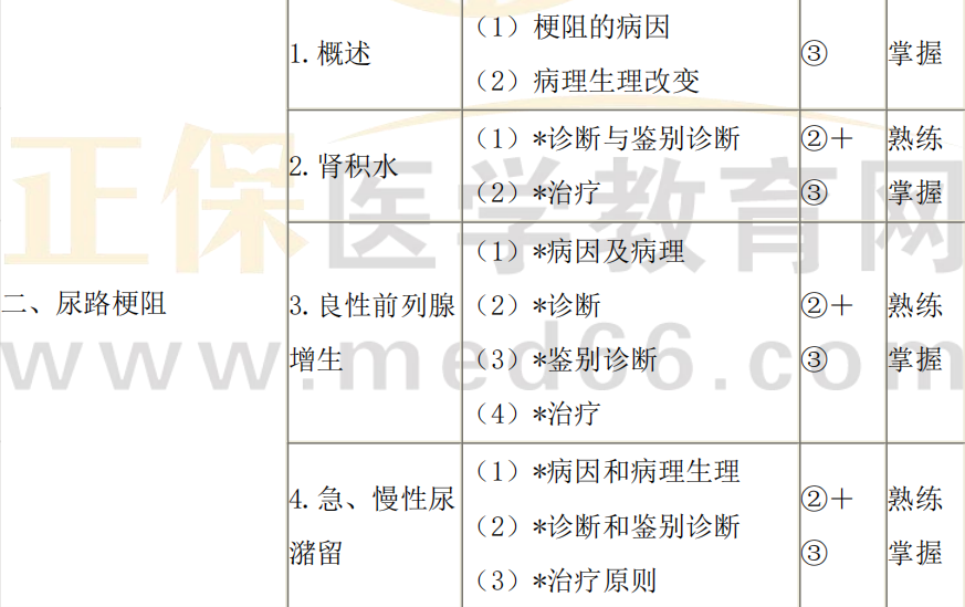 一、泌尿男生殖系疾病的主要癥狀與檢查診斷方法 | 1.主要癥狀 | (1)*排尿異常癥狀 | ②+③ | 熟練掌握 |