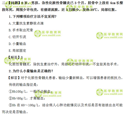 二、【問(wèn)題】8歲,男孩。急性化膿性骨髓炎已3個(gè)月,脛骨中上段有4cm長(zhǎng)整段壞死,周?chē)僭S包殼,有瘺道流膿。近3日膿少,發(fā)熱39℃,局部紅脹。下列哪項(xiàng)治療方法不宜采用?為什么小量輸血是正確的?