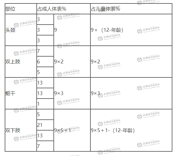 解釋:發(fā)、面、頸部均是3,雙手、雙前臂、雙上臂是567,軀干前、軀干后、雙大腿是13、13、21,成年女性足部-1、臀部+1(各為6%),一目了然。