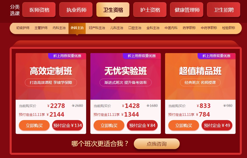 外科主治醫(yī)師“爽”11鉅惠正在進行時!預(yù)付定金立享8折!倒計時最后一天!優(yōu)惠券疊加享折上折,全年僅此一次,錯過再等一年,快來搶購吧!