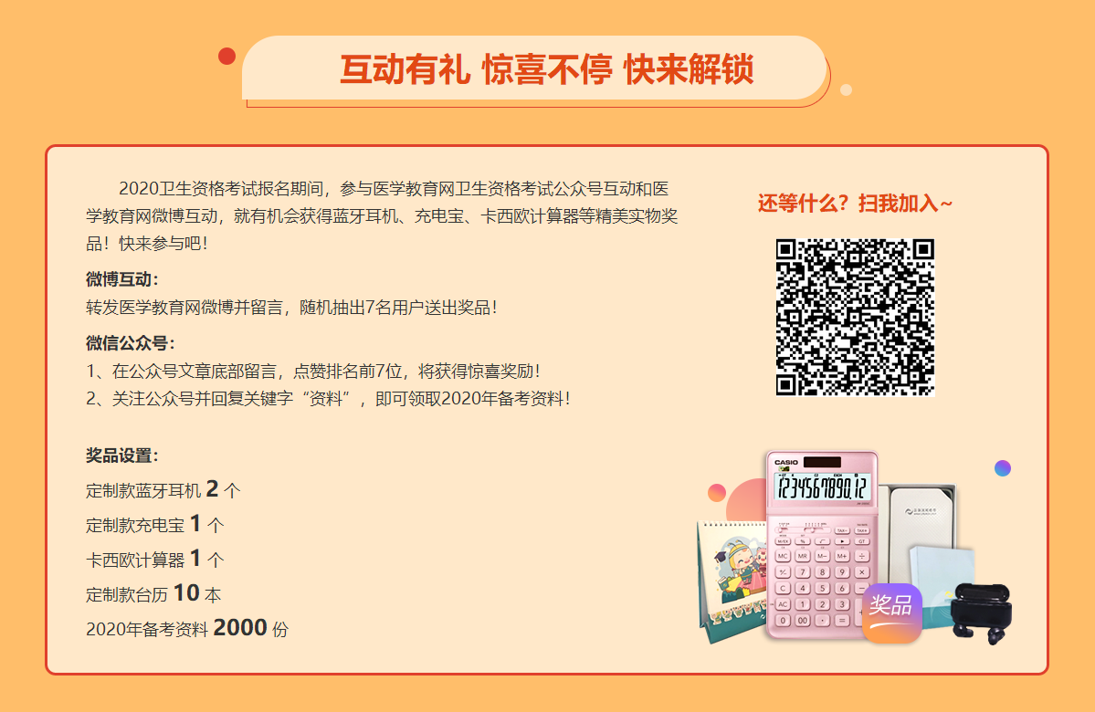 2000份外科主治醫(yī)師備考資料數(shù)量有限!先到先得哦!除了獲取備考資料,參與醫(yī)學(xué)教育網(wǎng)衛(wèi)生資格考試公眾號(hào)互動(dòng)和醫(yī)學(xué)教育網(wǎng)微博互動(dòng),還有機(jī)會(huì)獲得藍(lán)牙耳機(jī)、充電寶、卡西歐計(jì)算器等精美獎(jiǎng)品哦!