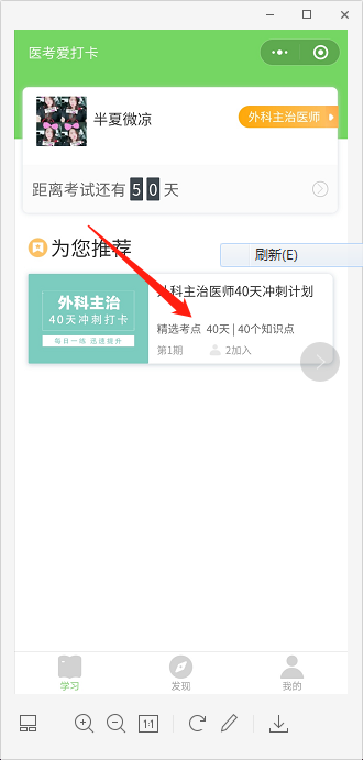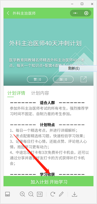 第三步:請選擇“您的備考計劃”,如“外科主治醫(yī)師40天沖刺計劃”,點擊下方“加入計劃開始學(xué)習(xí)”
