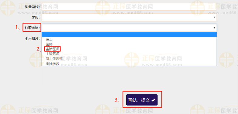 3、下拉選擇【任職資格】-【主治醫(yī)師】,點(diǎn)擊【確認(rèn),提交】