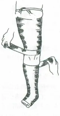 操作:仰臥抬高患肢,在大腿根部扎止血帶,從足趾向腘窩纏第1根彈力繃帶,從止血帶向下纏第2根彈力繃帶,讓患者站立,一邊向下解開第1根繃帶,一邊向下纏第2根繃帶
