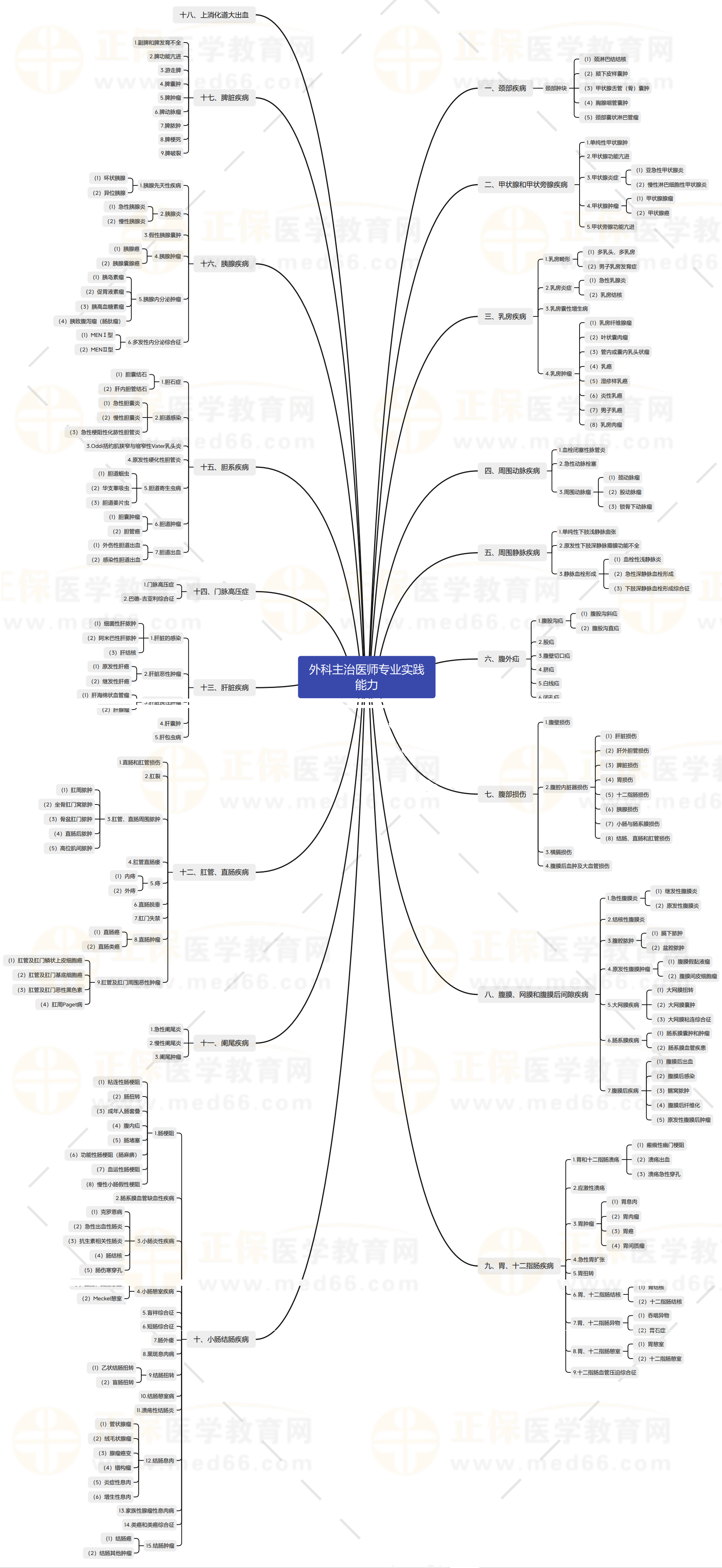 外科主治醫(yī)師考試實行全國統(tǒng)一組織、統(tǒng)一考試時間、統(tǒng)一考試大綱、統(tǒng)一考試命題、統(tǒng)一合格標(biāo)準(zhǔn)的考試制度,原則上每年進(jìn)行一次。2024年外科主治醫(yī)師考試新考期已經(jīng)開始了,為了幫助各位考生理清考試知識點脈絡(luò),更有針對性復(fù)習(xí),醫(yī)學(xué)教育網(wǎng)為大家整理外科主治醫(yī)師《專業(yè)實踐能力》知識點地圖如下: