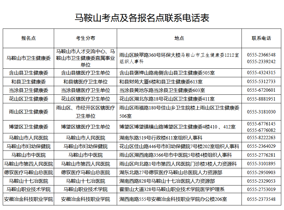 附件:馬鞍山考點及各報名點聯(lián)系電話表