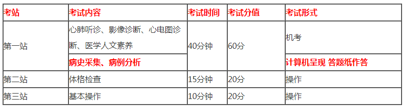 原第一站和第三站內(nèi)容合并為第一站,第一站采取計(jì)算機(jī)出題,紙筆作答形式,注意時(shí)間是40分鐘,分值占比最高是60分;原第二站內(nèi)容拆分為第二站和第三站,為第二站考體格檢查15分鐘20分,第三站考基本操作10分鐘20分。