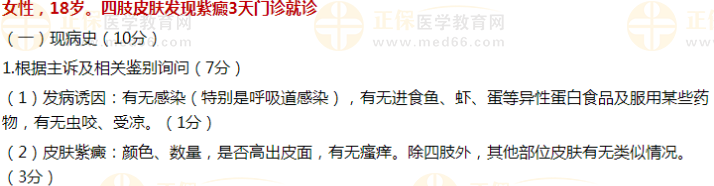 2021臨床執(zhí)業(yè)醫(yī)師技能病史采集練習(xí)題:四肢皮膚發(fā)現(xiàn)紫癜3天門診就診