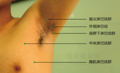 檢查者三指(示、中、環(huán)指)并攏,手指緊貼檢查部位皮膚,由淺及深進行滑動觸診。左手握被檢者左手,使其前臂稍外展,右手四指并攏稍彎曲,自尖群→中央群→胸肌群→肩胛下群→外側(cè)群順序進行觸摸。另一腋窩則相反