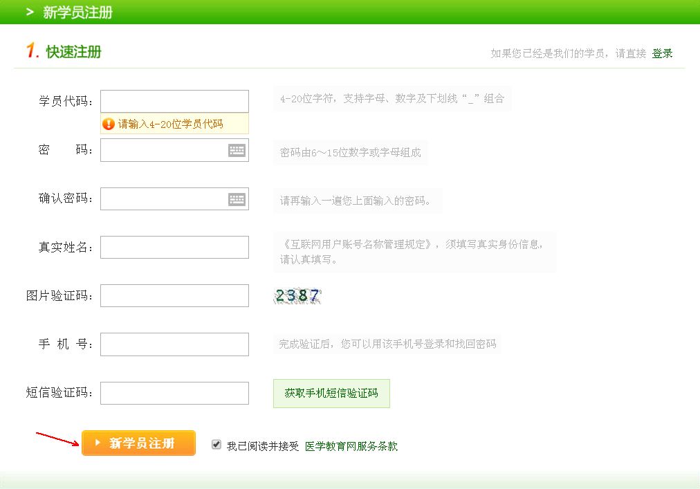 首先進(jìn)入醫(yī)學(xué)教育網(wǎng)首頁,左側(cè)有一個學(xué)員登錄的部分,點擊注冊即可進(jìn)入到注冊頁面,如下圖:
