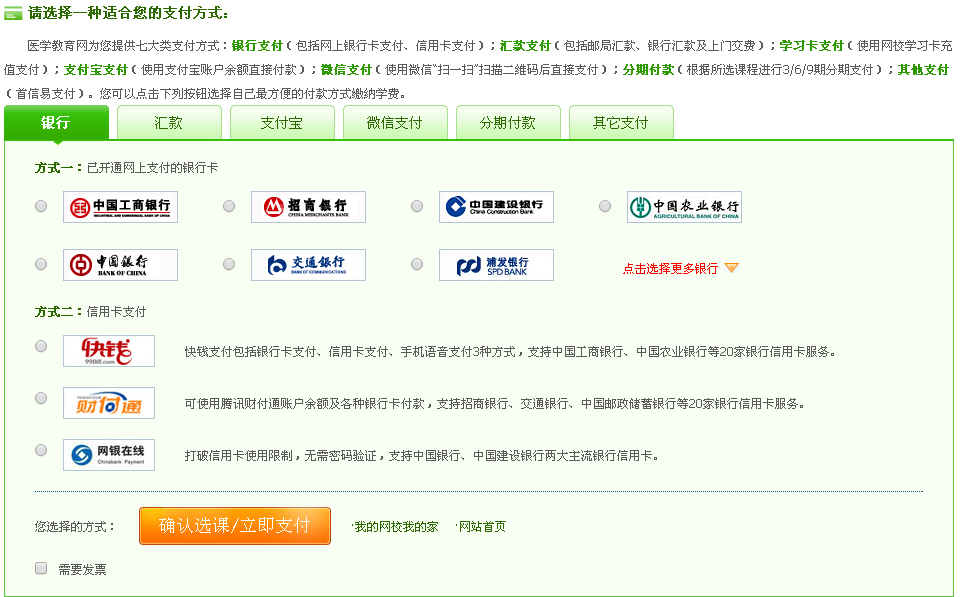 目前網(wǎng)校支持主流銀行網(wǎng)銀、支付寶支付、微信支付、學(xué)習(xí)卡支付、郵局匯款以及最新的分期付款,學(xué)員可以根據(jù)自身情況自由選擇付款方式,選擇好之后點擊確認(rèn)選課/立即支付會跳轉(zhuǎn)到相應(yīng)的付款界面,學(xué)員自行完成付款即可,有任何問題可以聯(lián)系網(wǎng)校。