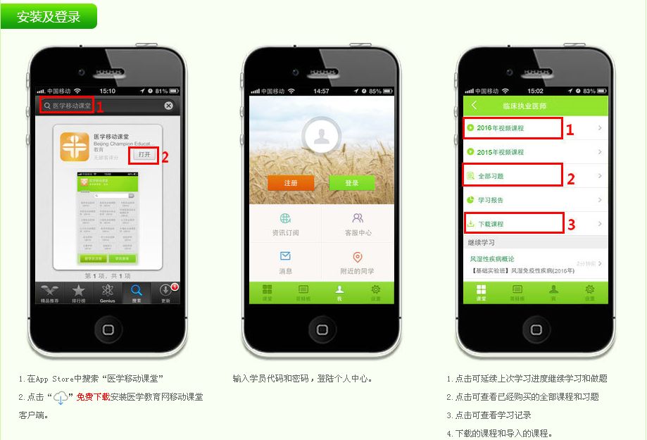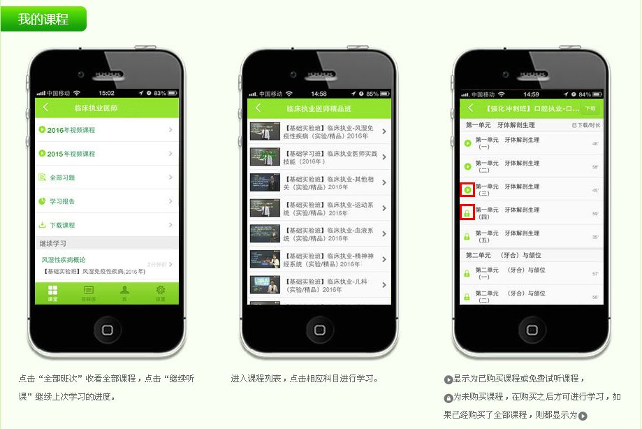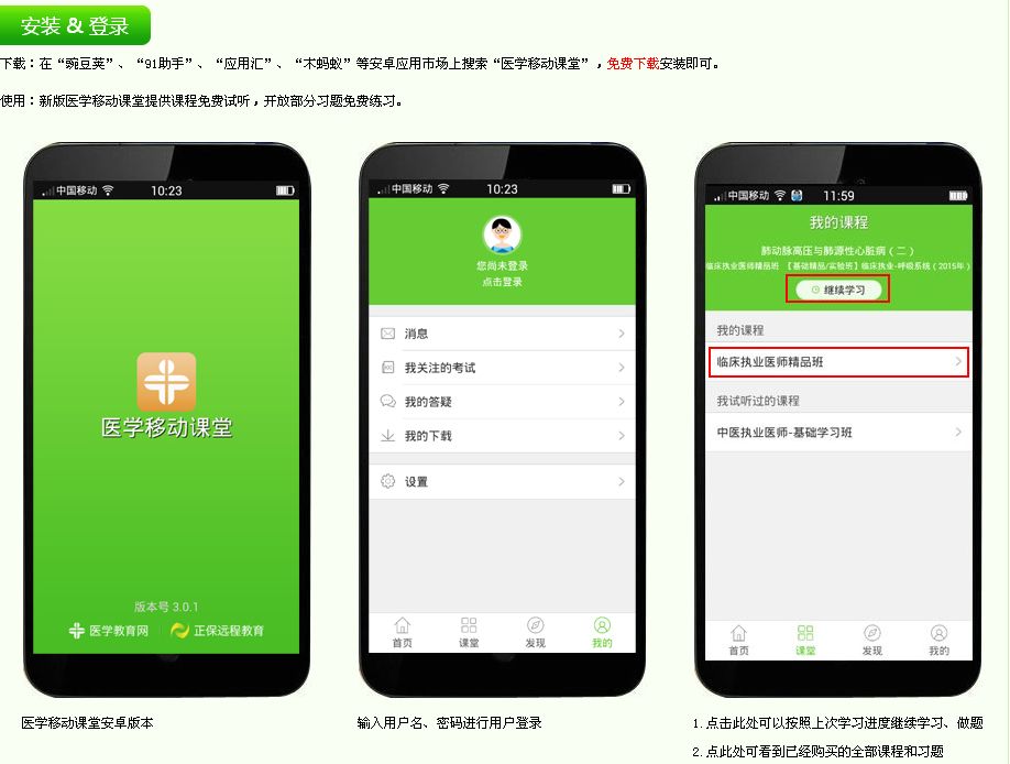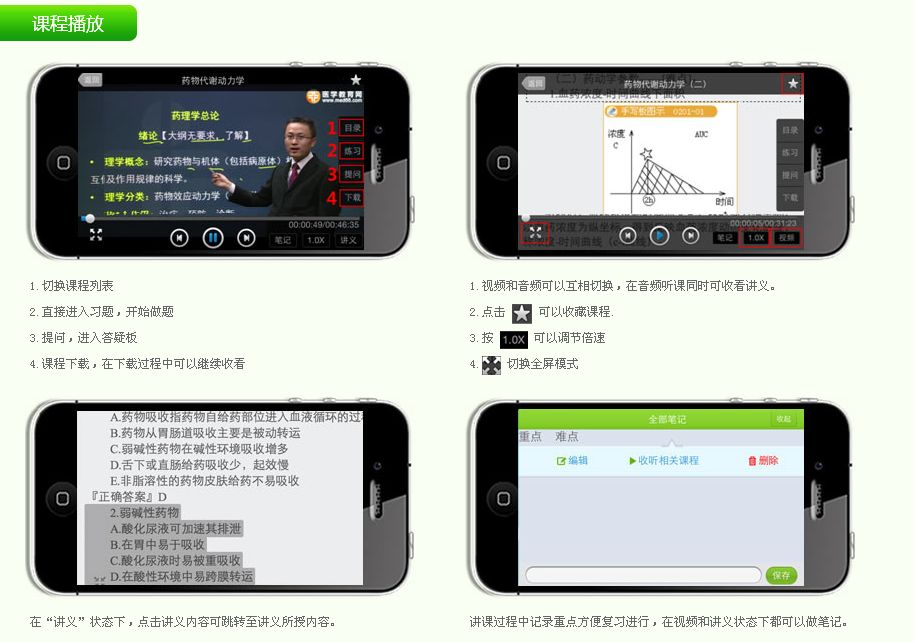 為方便廣大學(xué)員利用零碎時(shí)間進(jìn)行學(xué)習(xí),網(wǎng)校開(kāi)發(fā)了醫(yī)學(xué)移動(dòng)課堂手機(jī)版軟件、平板軟件,和電腦看課無(wú)縫銜接。下面分別介紹一下蘋果手機(jī)和安卓手機(jī)下如何使用醫(yī)學(xué)移動(dòng)課堂進(jìn)行看課。