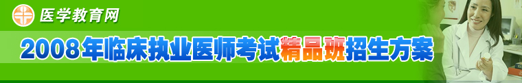 醫(yī)學(xué)教育網(wǎng)自推出臨床執(zhí)業(yè)醫(yī)師考試輔導(dǎo)以來,憑借雄厚的師資力量、領(lǐng)先的課件制作技術(shù)、嚴(yán)謹(jǐn)?shù)慕虒W(xué)作風(fēng)、靈活多樣的教學(xué)方式,高質(zhì)量的教學(xué)效果,受到了廣大考生的一致好評(píng),在總結(jié)過去多年輔導(dǎo)成功經(jīng)驗(yàn)的基礎(chǔ)上,十佳網(wǎng)絡(luò)教育機(jī)構(gòu)----醫(yī)學(xué)教育網(wǎng)組織了一大批臨床執(zhí)業(yè)醫(yī)師考試輔導(dǎo)專家教授,從廣大考生的實(shí)際需求出發(fā),融入先進(jìn)的教學(xué)理念,大膽創(chuàng)新,結(jié)合臨床執(zhí)業(yè)醫(yī)師考試的命題規(guī)律、重點(diǎn)、難點(diǎn)、疑點(diǎn)、采用全新的智能交互手段,現(xiàn)強(qiáng)勢(shì)推出“2008年臨床執(zhí)業(yè)醫(yī)師考試精品班”,享受臨床執(zhí)業(yè)醫(yī)師考試實(shí)驗(yàn)班全套教學(xué)服務(wù),針對(duì)每個(gè)考生的不同學(xué)習(xí)狀況、進(jìn)行有針對(duì)性的講解、訓(xùn)練、答疑、?、并對(duì)學(xué)習(xí)過程進(jìn)行全程跟蹤、分析、指導(dǎo),從整體上大幅提升學(xué)員的考試通過率,現(xiàn)在報(bào)名更有超值優(yōu)惠,機(jī)會(huì)難得,欲報(bào)從速。