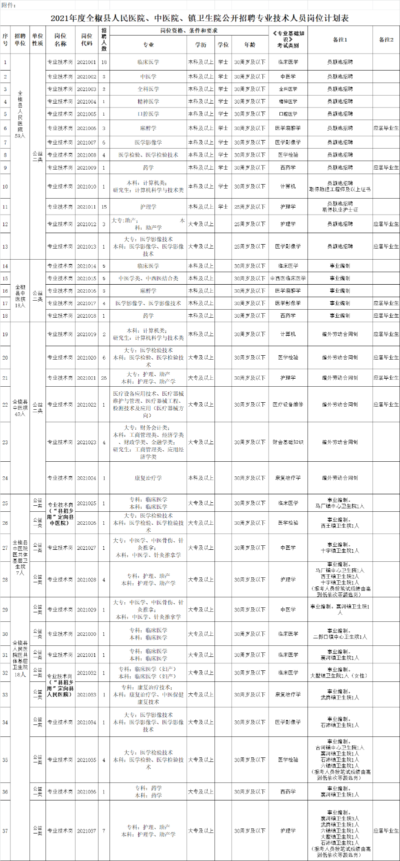 2021年度全椒縣人民醫(yī)院、中醫(yī)院、鎮(zhèn)衛(wèi)生院面向社會(huì)公開招聘專業(yè)技術(shù)人員142名,其中:縣人民醫(yī)院?jiǎn)T額池(社會(huì)化用人)計(jì)劃59名,縣中醫(yī)院計(jì)劃58名(其中:使用事業(yè)編制18名、勞動(dòng)合同制管理40名),鎮(zhèn)衛(wèi)生院計(jì)劃25名(其中:2名為縣中醫(yī)院實(shí)施“縣招鄉(xiāng)用”人員,2名為縣人民醫(yī)院實(shí)施“縣招鄉(xiāng)用”人員)。具體崗位詳見附件:《2021年度全椒縣人民醫(yī)院、中醫(yī)院、鎮(zhèn)衛(wèi)生院公開招聘專業(yè)技術(shù)人員崗位計(jì)劃表》(以下簡(jiǎn)稱《崗位計(jì)劃表》)。《崗位計(jì)劃表》中專業(yè)要求按照教育部下發(fā)的專業(yè)目錄執(zhí)行。其中:2021025-2021026、2021032-2021033崗位由縣域醫(yī)共體牽頭醫(yī)院實(shí)施“縣招鄉(xiāng)用”,前5年落實(shí)所在基層衛(wèi)生院編制、崗位及工資待遇。服務(wù)滿5年后,根據(jù)本人意愿,經(jīng)考核合格,擇優(yōu)調(diào)回牽頭醫(yī)院工作,納入牽頭醫(yī)院社會(huì)化用人管理,實(shí)施同崗?fù)甏觥W栽噶粼诨鶎有l(wèi)生院工作的,繼續(xù)享受所在基層單位崗位編制內(nèi)人員相關(guān)政策待遇。