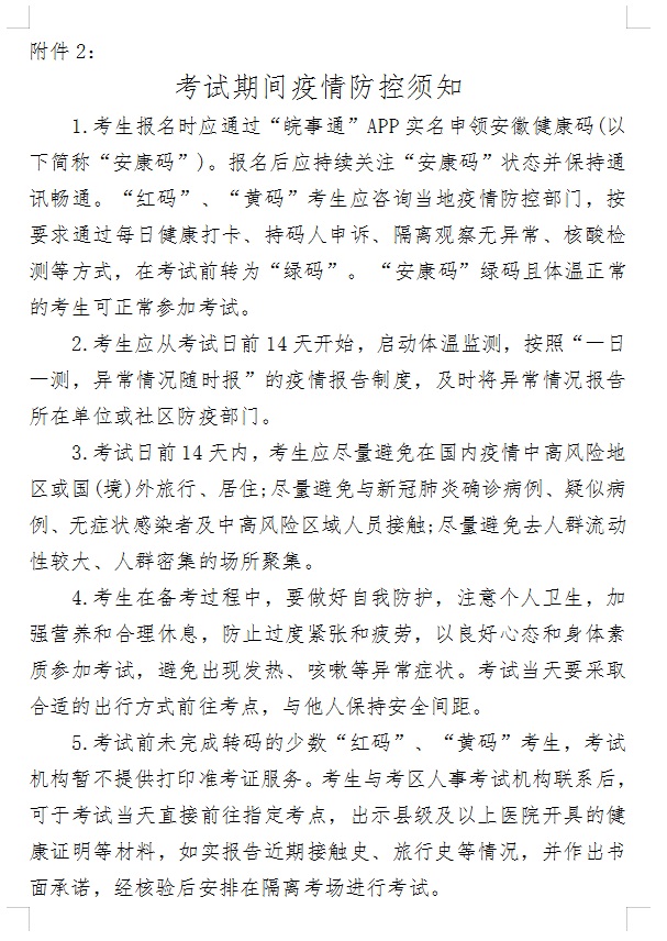 報考人員報名前,應通過“皖事通”APP實名申領“安康碼”。報考人員報考前請認真閱讀《考試期間疫情防控須知》(附件2)。報考人員提供的信息必須與本人實際情況、報考條件和所報考的崗位要求相一致。凡弄虛作假通過資格審查,其實際情況與報考條件規(guī)定不符的,一經(jīng)查實,即取消考試、聘用等資格。