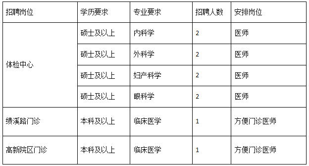 3.體檢中心醫(yī)師崗位:碩士及以上學(xué)歷,符合崗位專業(yè)要求,35周歲以下(1985年1月1日以后出生),有三甲醫(yī)院從事招聘相應(yīng)專業(yè)2年以上工作經(jīng)歷,具有執(zhí)業(yè)醫(yī)師資格,愿意專職從事健康體檢工作。