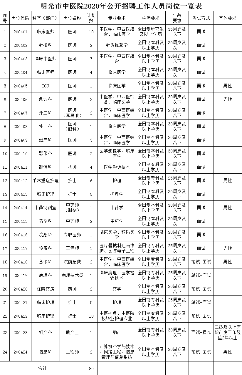 具體崗位詳見附件:《明光市中醫(yī)院2020年公開招聘工作人員崗位一覽表》(以下簡稱《崗位一覽表》)。