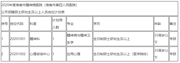 安徽省淮南市精神病醫(yī)院2020年公開招聘醫(yī)療崗崗位計(jì)劃表
