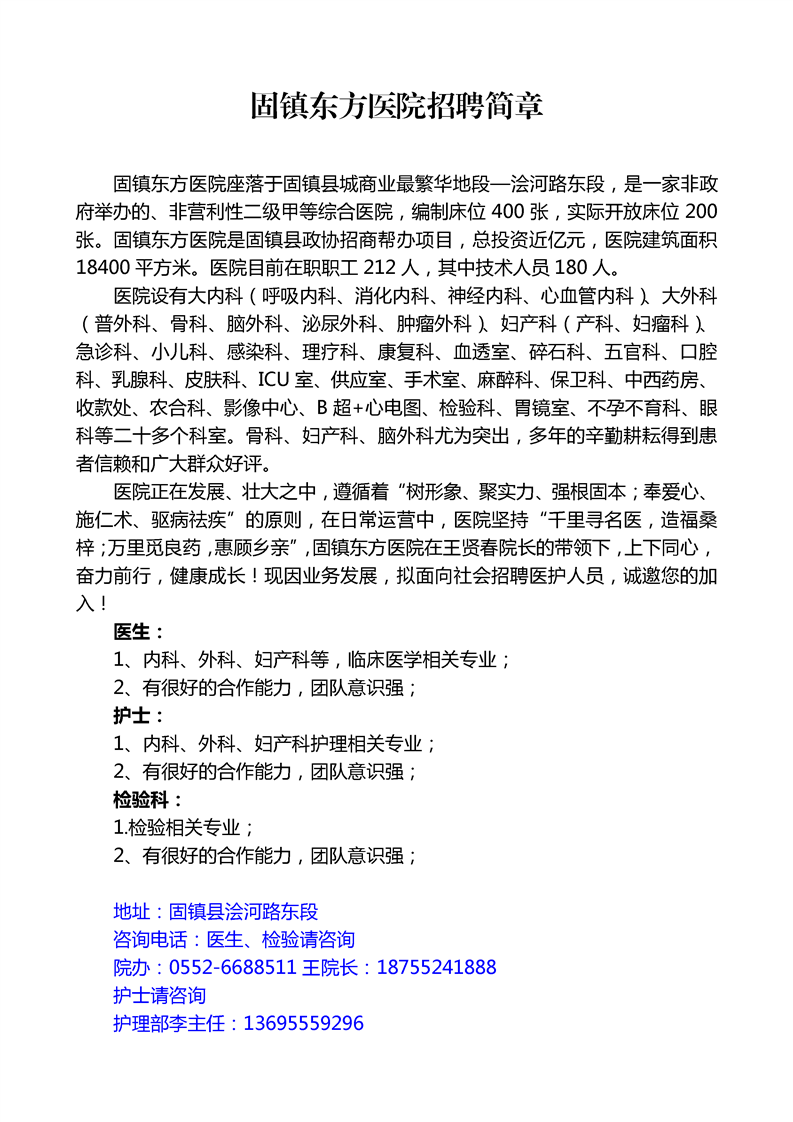 安徽省蚌埠市固鎮(zhèn)東方醫(yī)院2022年招聘醫(yī)生、護(hù)士公告