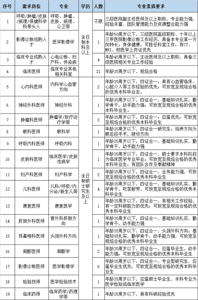 3、“招聘崗位及要求”中未列出的專業(yè)崗位,優(yōu)秀碩士及以上研究生和已規(guī)培人員也可以電話咨詢或報名。