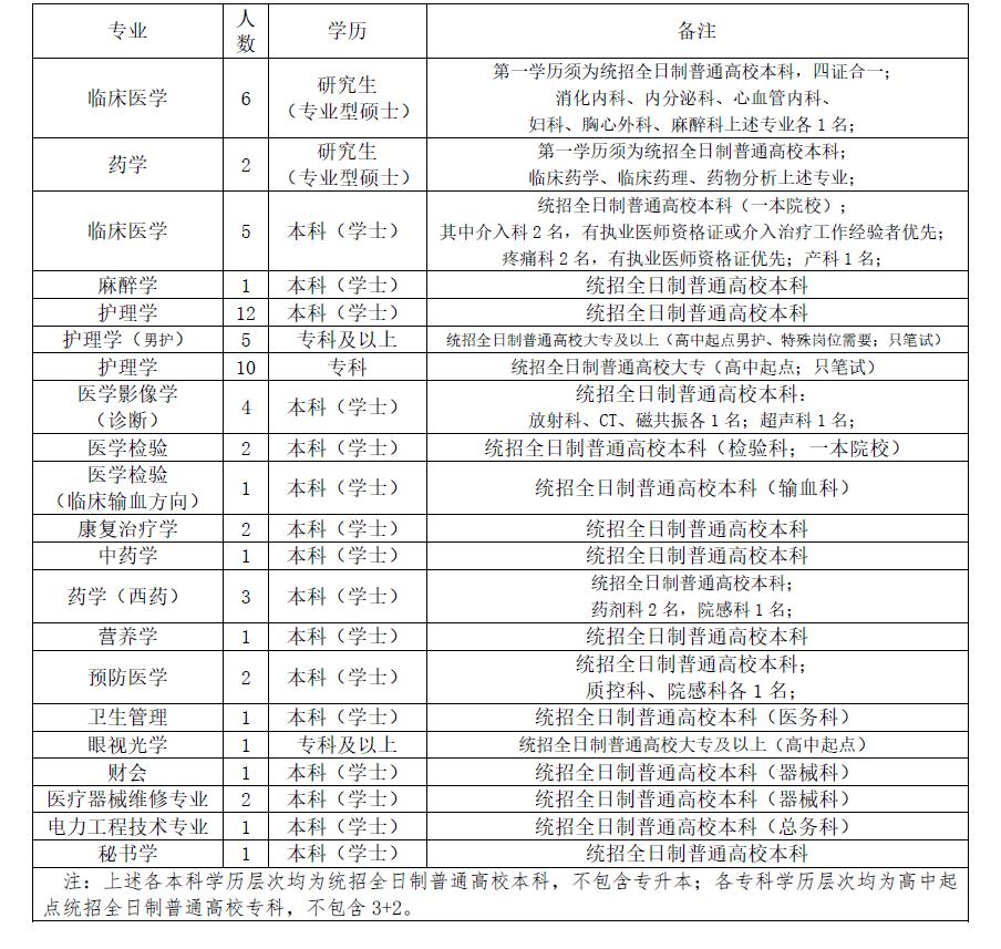 阜南縣人民醫(yī)院2022年擬招聘2020—2022屆統(tǒng)招全日制普通高校畢業(yè)生64名(2020屆畢業(yè)生須有所學(xué)專業(yè)執(zhí)業(yè)證書或資格證書),具體招聘人數(shù)、學(xué)歷和專業(yè)條件等見下表。