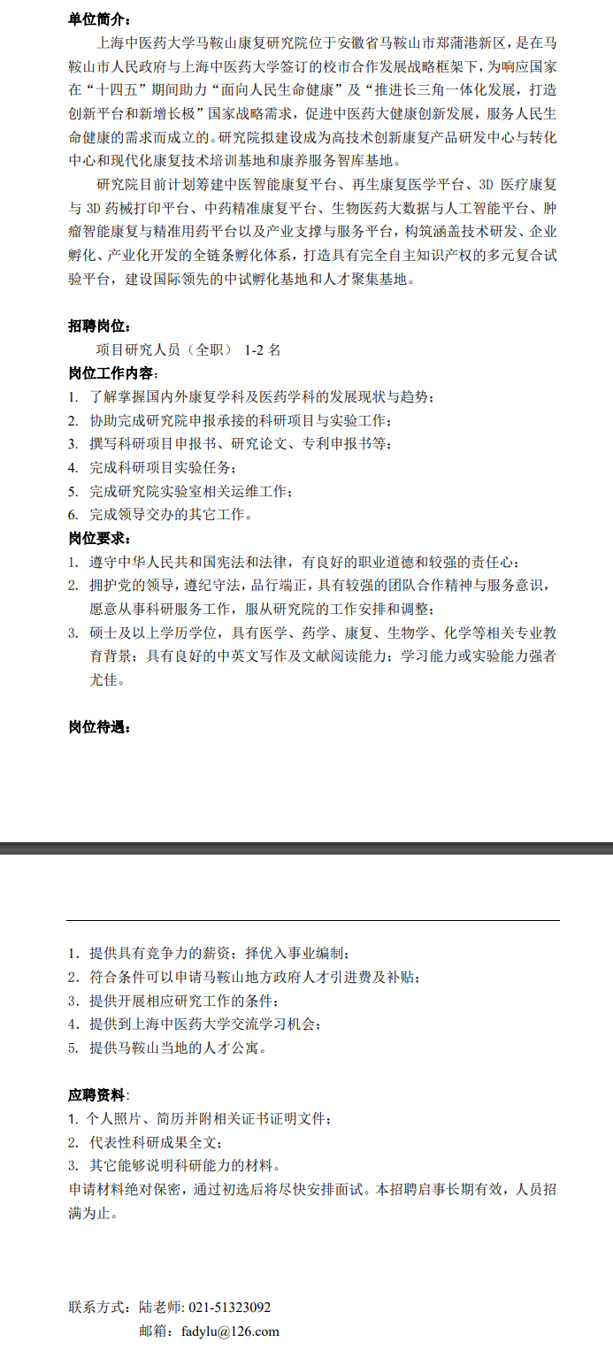 上海中醫(yī)藥大學馬鞍山康復研究院招聘項目研究人員1-2名