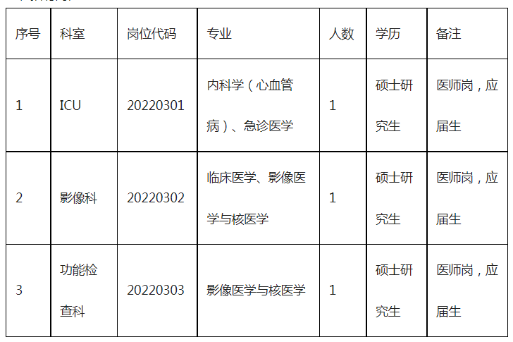(五)專業(yè):專業(yè)對口,醫(yī)學(xué)類崗位要求本科專業(yè)為5年制/4年制臨床醫(yī)學(xué)或與碩士研究生專業(yè)一致,非醫(yī)學(xué)類崗位要求本科專業(yè)與碩士研究生專業(yè)或崗位相關(guān)。