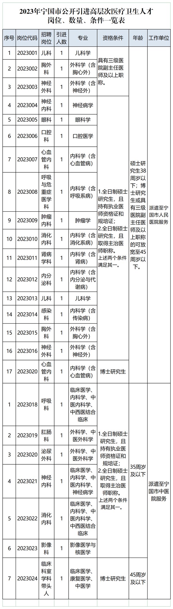 2023年寧國市公開引進(jìn)高層次醫(yī)療衛(wèi)生人才24名,其中市人民醫(yī)院17名,市中醫(yī)院7名,具體崗位、專業(yè)等要求詳見《2023年寧國市公開引進(jìn)高層次醫(yī)療衛(wèi)生人才崗位、數(shù)量、條件一覽表》(附件1)。