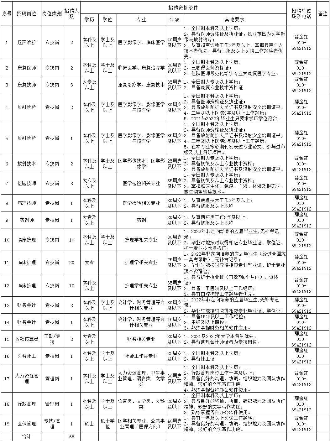 本次招聘19個崗位共計68人。詳情見附件《北京市順義區(qū)醫(yī)院2022年招聘編外衛(wèi)技、財會、管理等崗位資格條件表》,以下簡稱《崗位資格條件表》。
